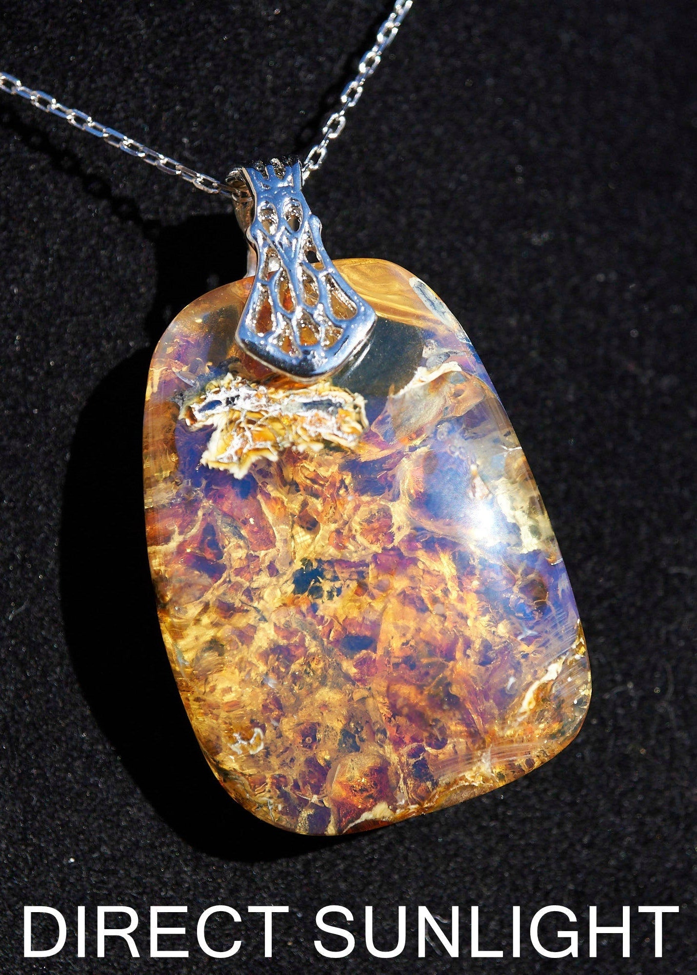 A stunningly beautiful piece of jewelry, it is a nice size, great quality and met my expectations. I posted my pictures of it both under UV light and direct sunlight. It came with certificate of authenticity which is great!