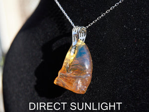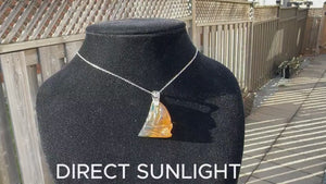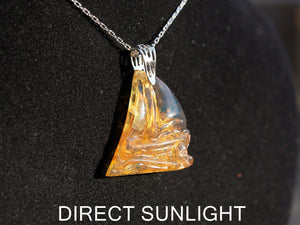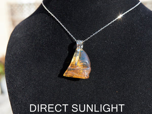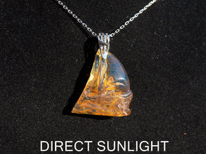 Inspired by the journey of mystic mariners, this “Mystic Mariners’ Journey Pendant” features a detailed sailboat carved in glowing blue amber, symbolizing adventure, protection, and smooth sailing ahead. The rare Dominican Blue Amber shifts from warm tones indoors to a vivid blue sheen in sunlight, making the boat look like it is sailing on a luminous ocean.