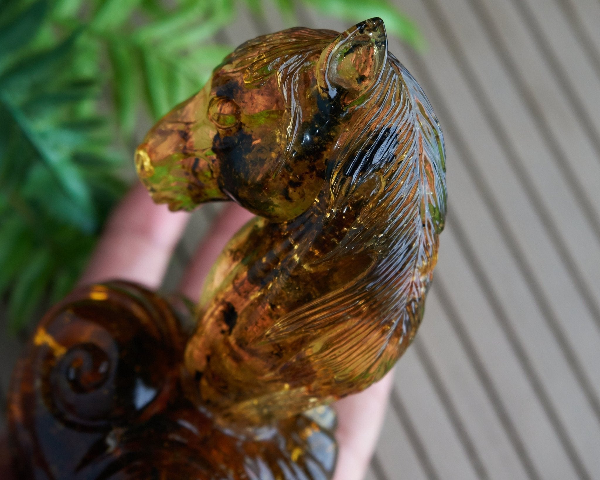 A stunning hand-carved horse head sculpture crafted from 100% genuine Dominican green amber. This exceptional piece showcases the natural beauty and craftsmanship that makes Dominican amber world-renowned.
