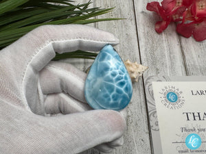 Experience the unparalleled beauty of a premium Larimar cabochon, sourced exclusively from the Dominican Republic—the only place on Earth where this rare gemstone is found. Renowned for its striking sky-blue to oceanic turquoise hues and ethereal white marbling, this top-grade Larimar exudes a serene, tropical allure that captures the essence of tranquil Caribbean waters.