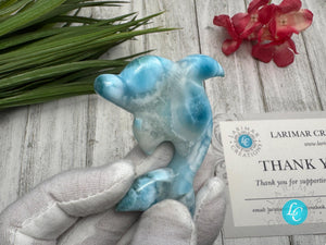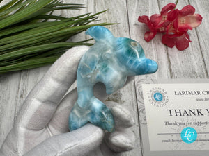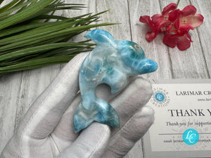 Bring a splash of the ocean to your jewelry collection with this hand-carved Dolphin Larimar Pendant! Expertly crafted from genuine AAA Larimar, this stunning blue gemstone features natural fractal patterns unique to every piece. The playful dolphin design celebrates your love of the sea and makes a perfect statement piece for any ocean lover.