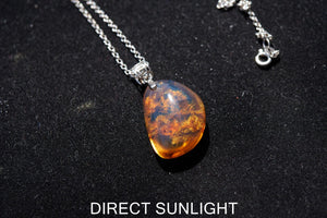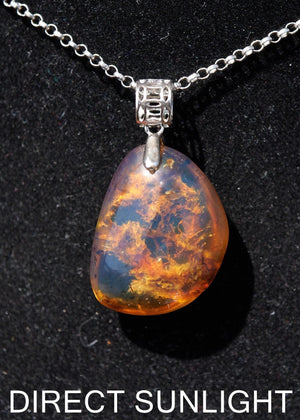 You are purchasing a 100% authentic natural Dominican Blue Amber teardrop pendant with a small fossilized plant inclusion, set in 925 sterling silver. This compact piece glows with rich color under sunlight and is ideal for collectors who love both gemstones and visible traces of ancient life.