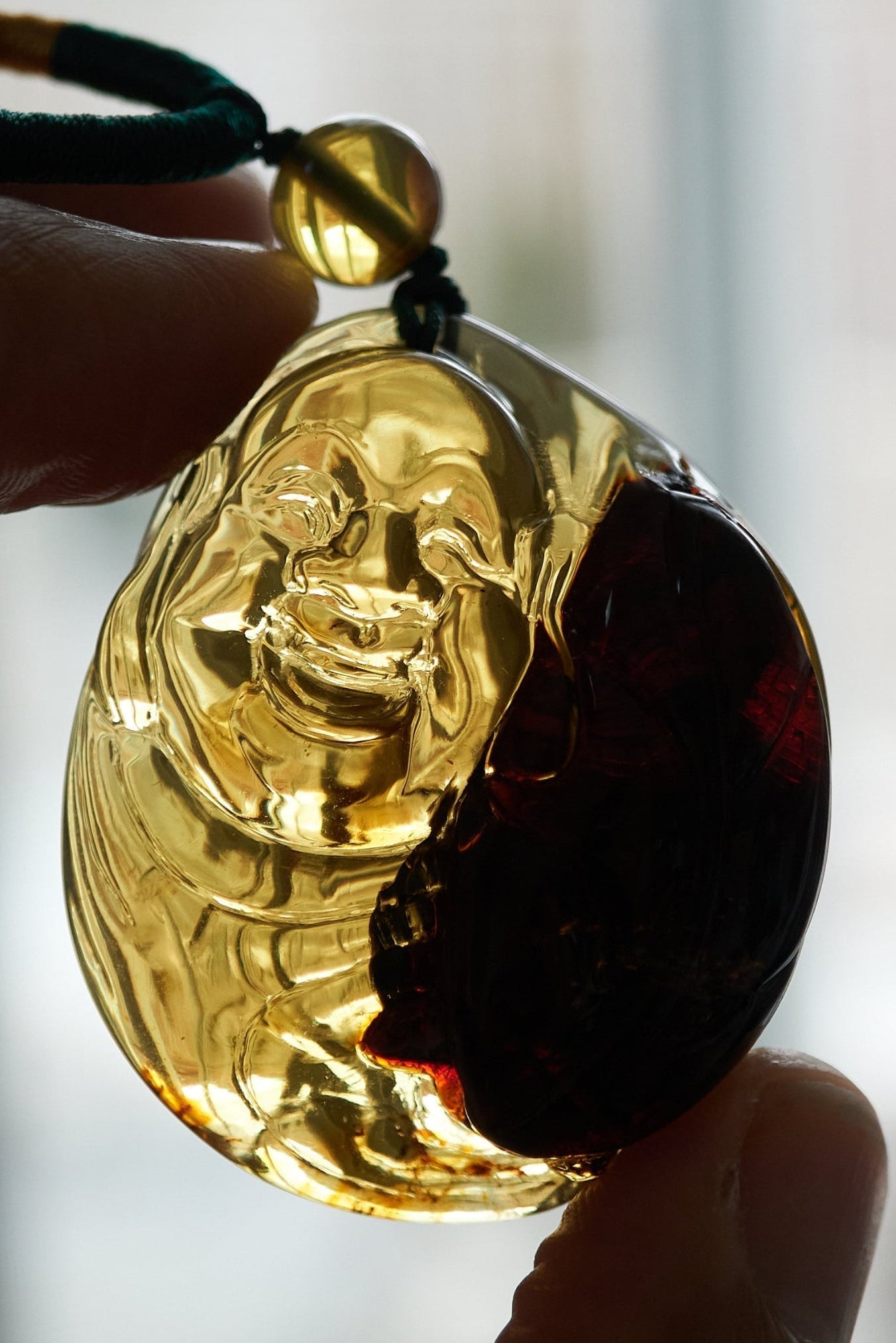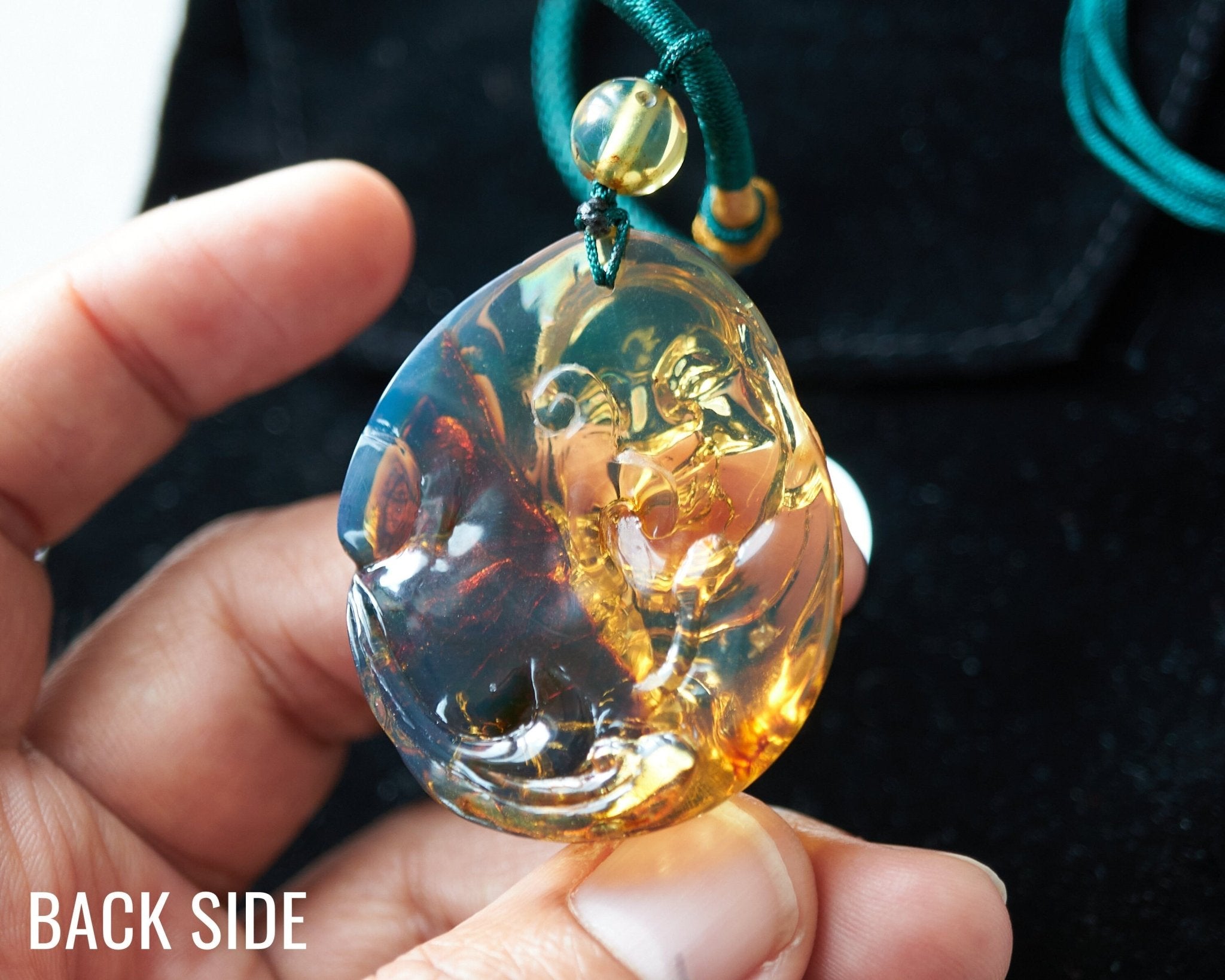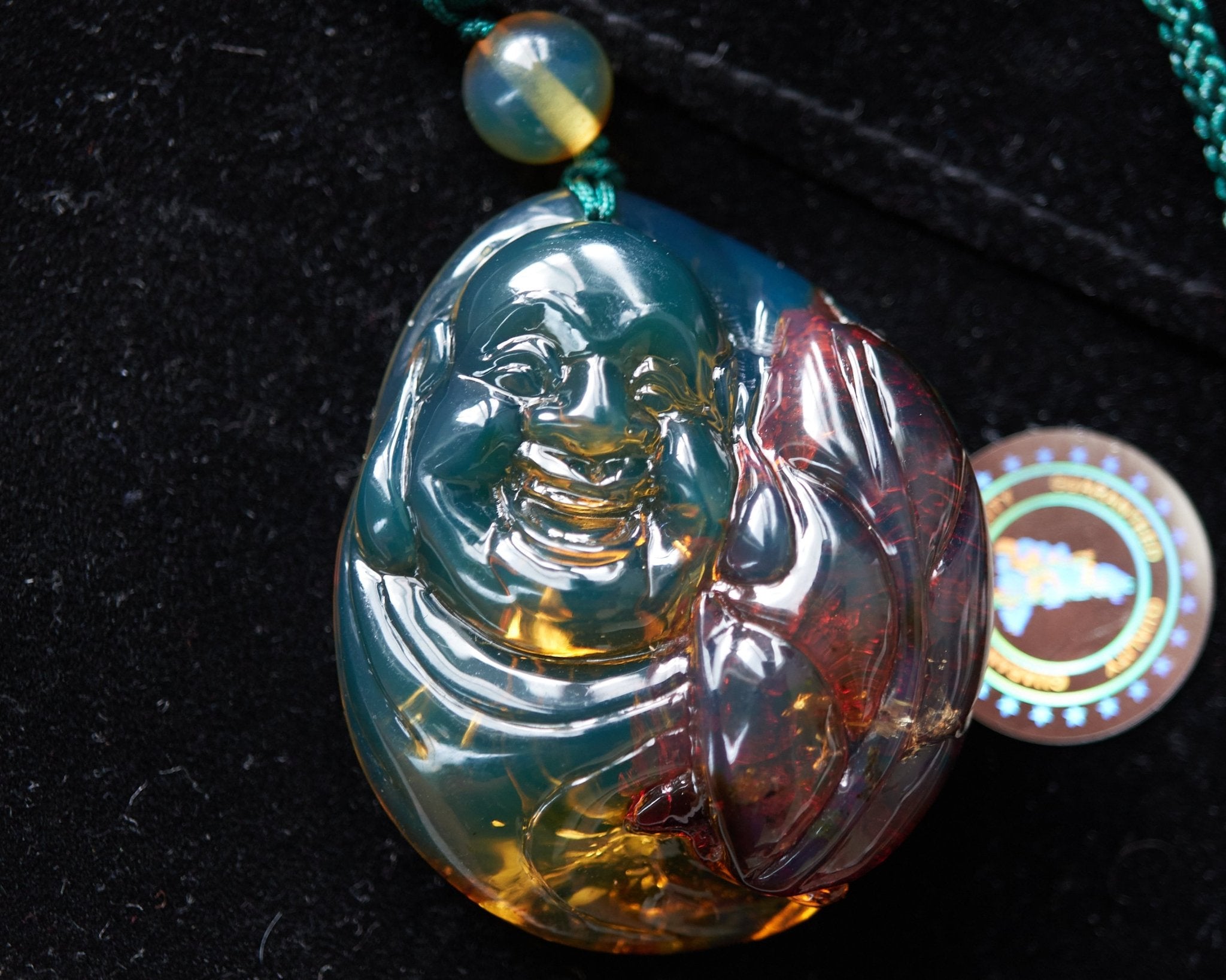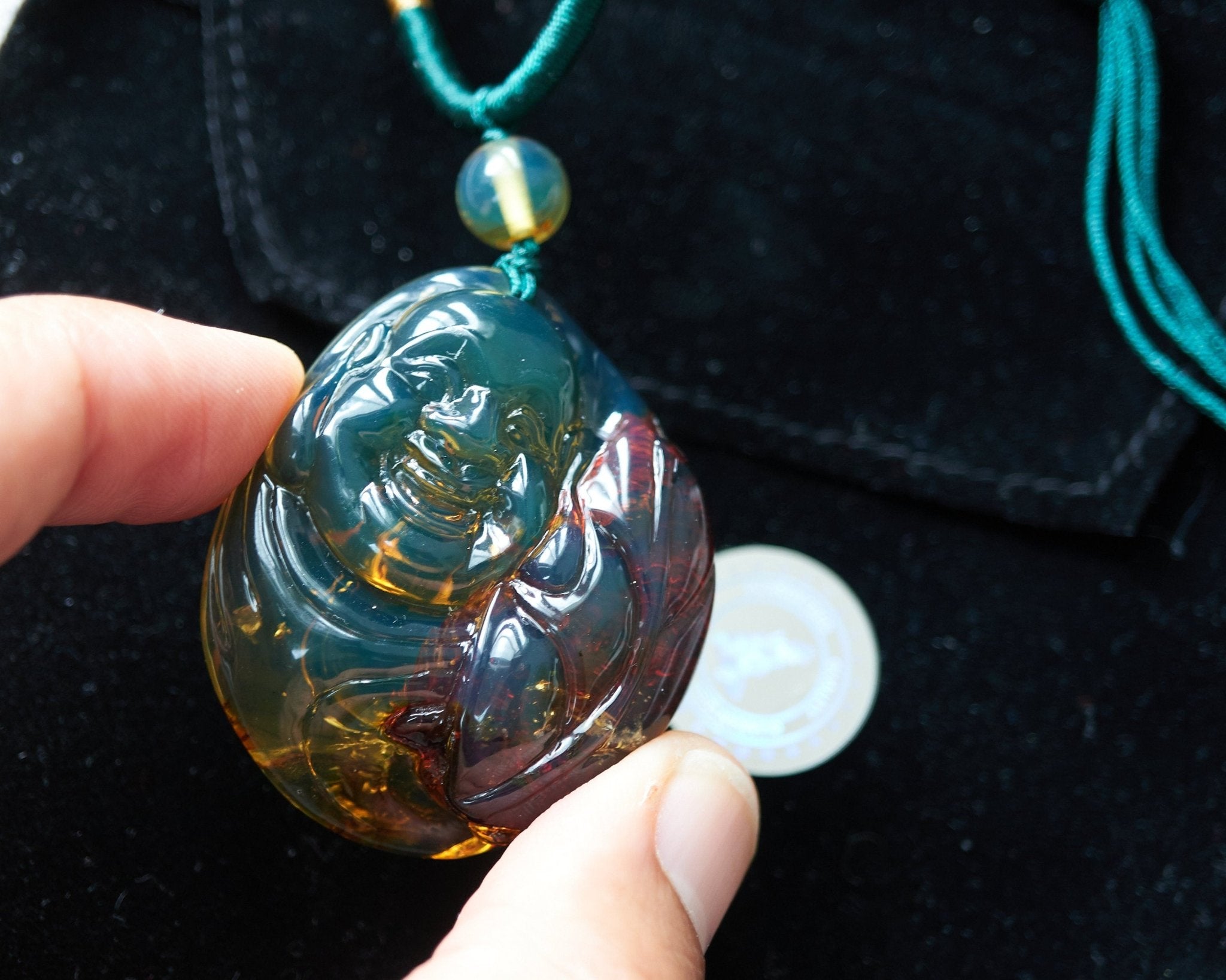 🔥You are purchasing a 100% Authentic Blue Amber Dominican Happy Buddha Carving nice blue color red shaped leaf on the right side.