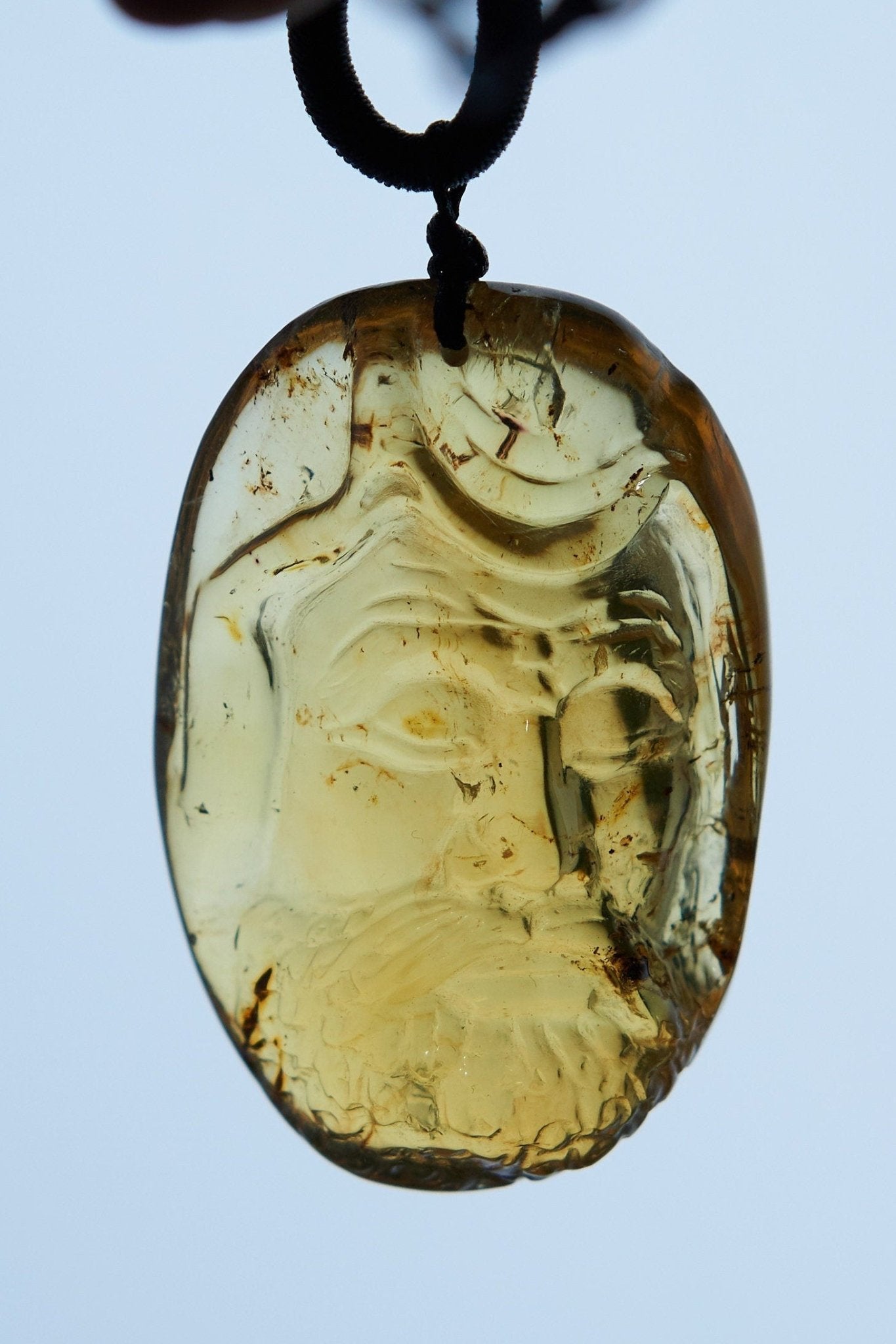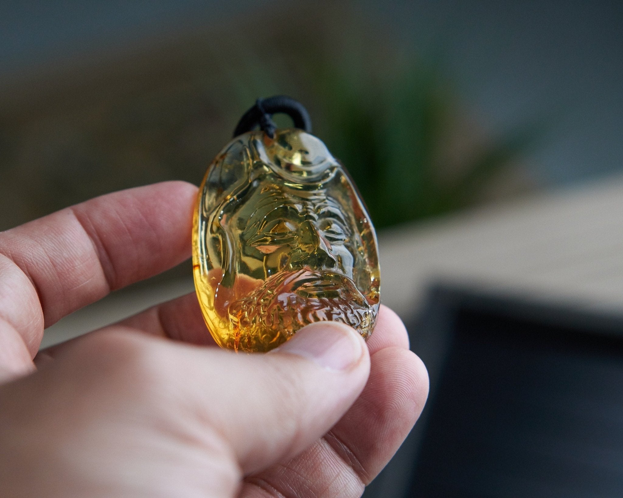 - Materials: Authentic Blue / Green Dominican Amber Damo / Dharma hand carving with Adjustable rope. Arhat Damo Bodhidharma Dharma Buddha Carving