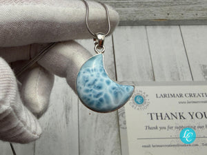 Discover the enchanting beauty of our Handmade Larimar Moon Pendant, a stunning piece featuring a large, natural blue gemstone crafted into a graceful moon shape. This unique larimar necklace showcases a vibrant AA+ quality cabochon with deep sea blue hues and captivating patterns, making each pendant one-of-a-kind. The open-back design allows light to beautifully illuminate the stone, enhancing its mesmerizing colors and intricate details.