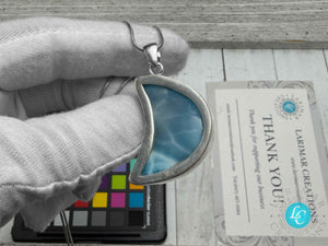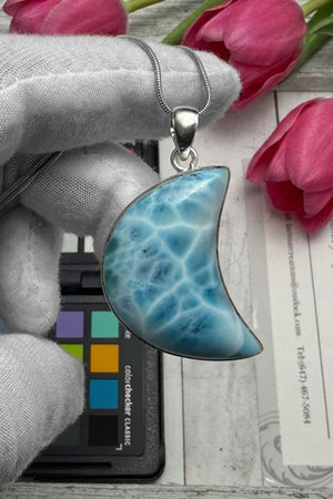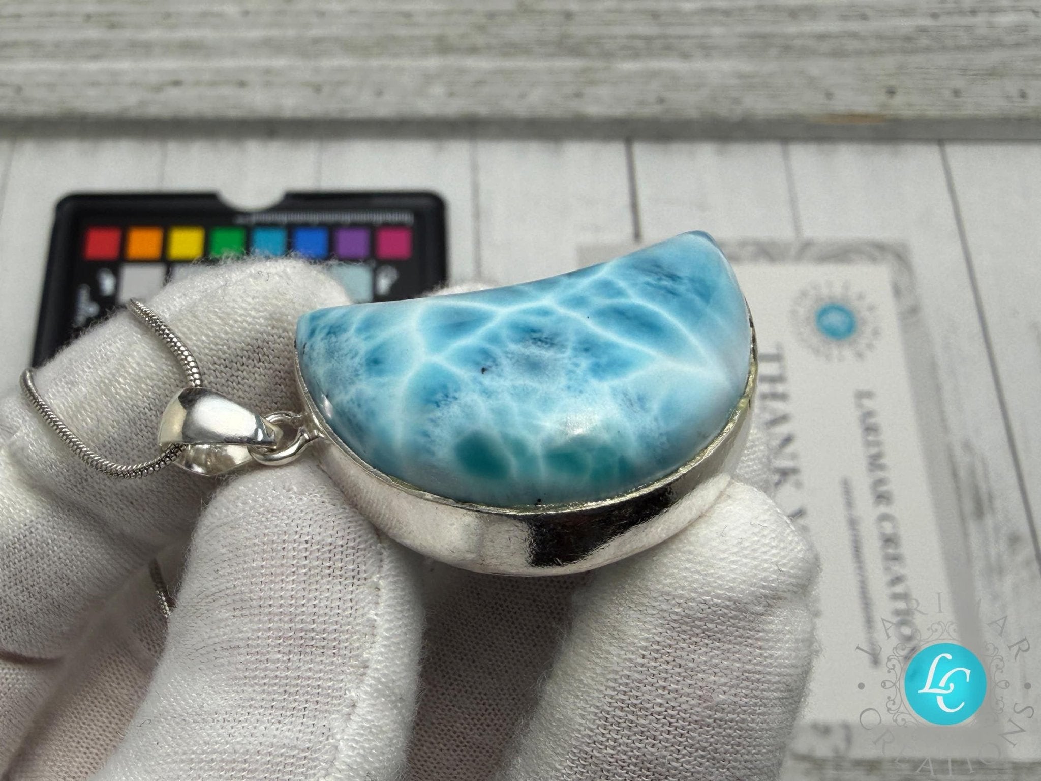 Bring the calming beauty of the Caribbean ocean to your jewelry collection with this ultra high quality large Larimar moon pendant. Featuring stunning natural blue hues and soft white marbling, this statement gemstone necklace captures the peaceful essence of sea and sky.
