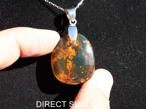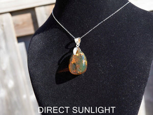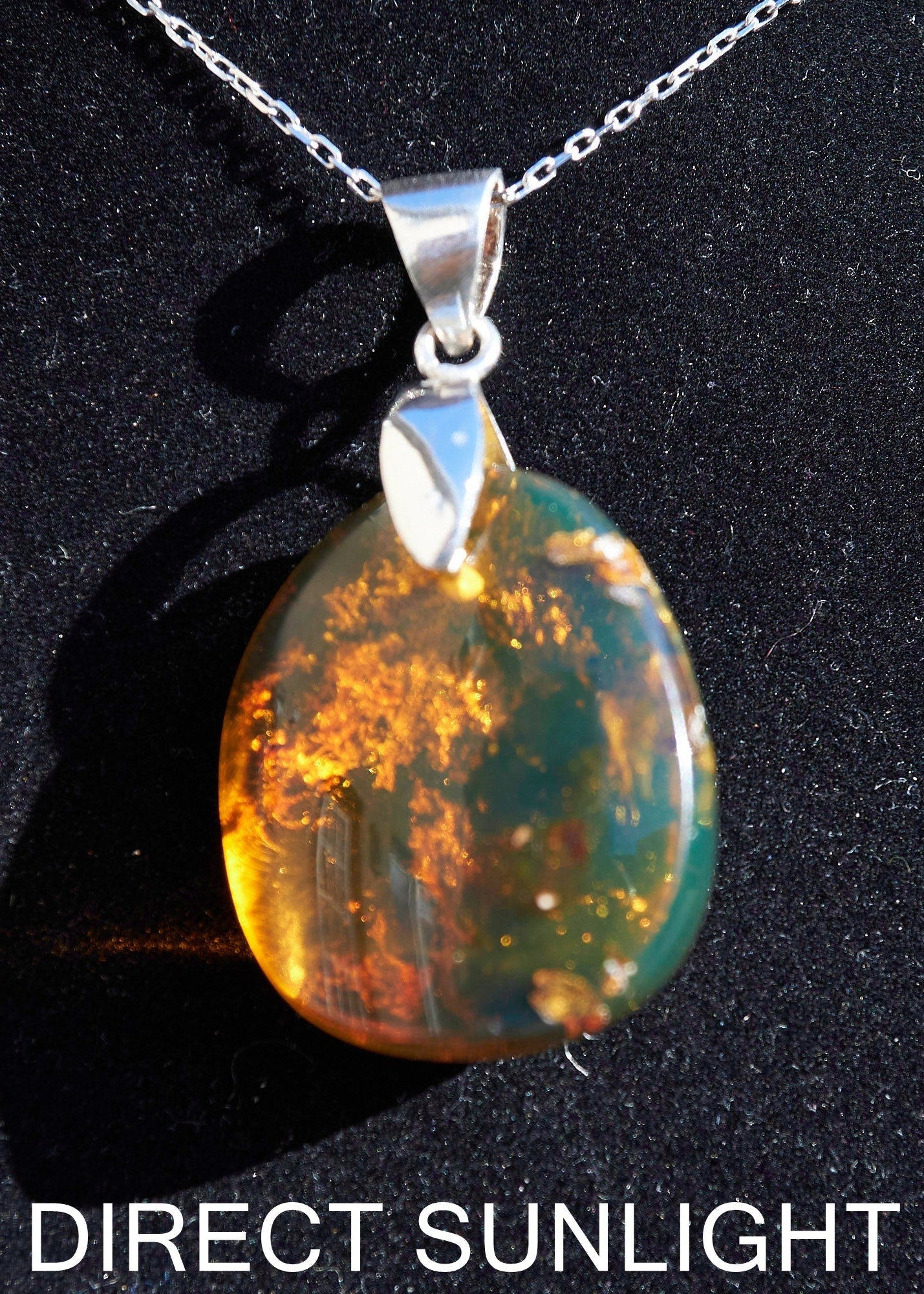 You are purchasing an authentic Dominican blue/green amber cabochon pendant, known for its warm, calming energy and beautiful color that comes alive under sunlight. This piece is perfect for anyone who loves spiritual jewelry, crystal healing, and unique gemstones with a deep connection to nature and time.