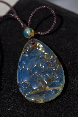 šDominican Blue Amber Pendant cabochon natural shaped Teardrop Flower Carving ready to wear on adjustable rope, Just Gorgeous!
