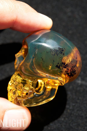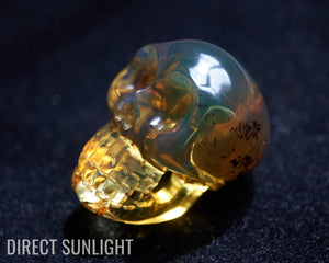 A stunning handcrafted skull carved from rare Dominican blue amber. This unique piece showcases mesmerizing natural green and blue fluorescence—a phenomenon found only in Dominican amber. A must-have for collectors and amber enthusiasts.