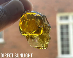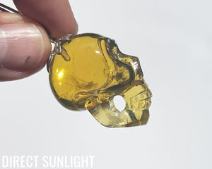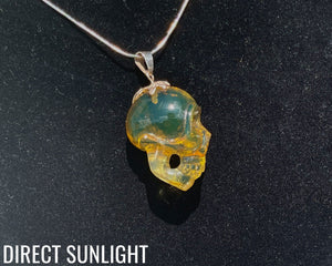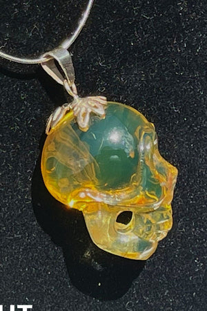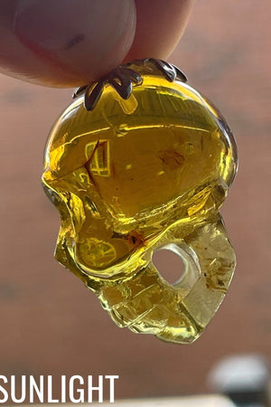 A beautifully hand-carved skull pendant in rare Dominican green amber with exceptional 97% clarity. This realistic carving showcases the natural green fluorescence and remarkable purity that makes Dominican amber so prized by collectors.