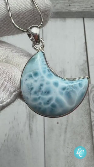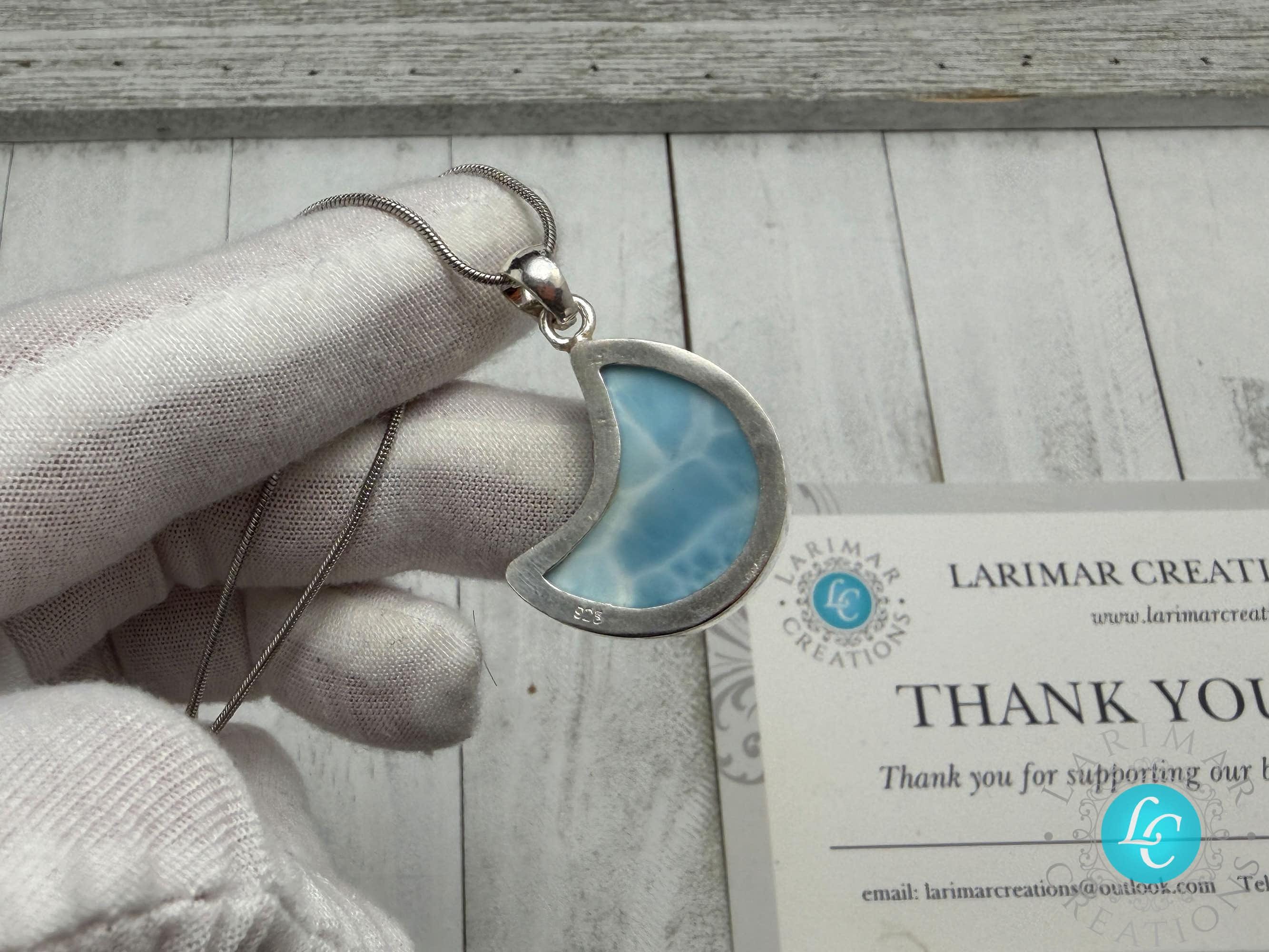 Discover the enchanting beauty of our Handmade Larimar Moon Pendant, a stunning piece featuring a large, natural blue gemstone crafted into a graceful moon shape. This unique larimar necklace showcases a vibrant AA+ quality cabochon with deep sea blue hues and captivating patterns, making each pendant one-of-a-kind. The open-back design allows light to beautifully illuminate the stone, enhancing its mesmerizing colors and intricate details.