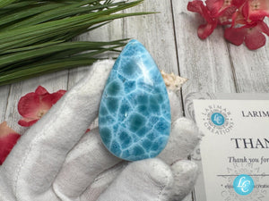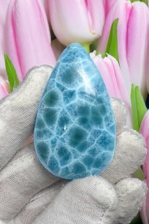 High-quality Larimar cabochon, a natural gemstone prized for its serene Caribbean blue hues and delicate white patterns. Hand-polished to perfection, this one-of-a-kind gemstone is ideal for creating unique jewelry, whether as a statement pendant,