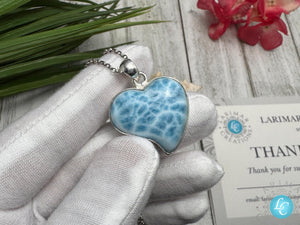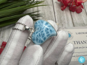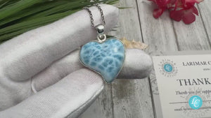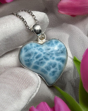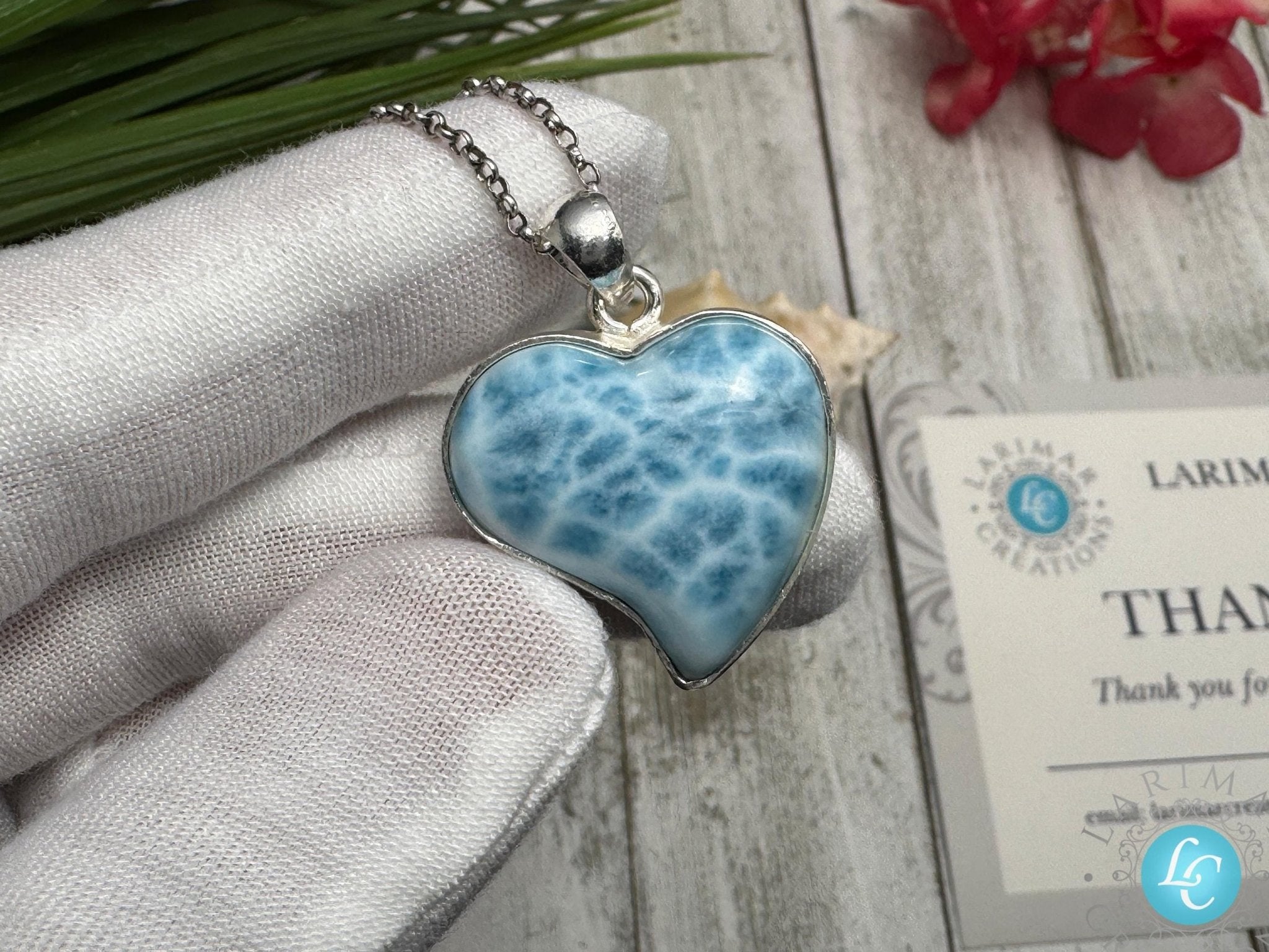 Natural Heart-shaped Larimar pendant featuring polished ocean-blue hues with white marbling, perfect for jewelry making or as a healing crystal collectible